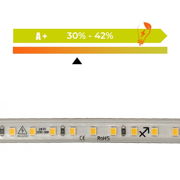 Esta Tira LED 220V DC 120LED/m IP67 tiene una longitud de 20 metros e integra 120 LED de tecnología SMD2835 de gran eficiencia que tan sólo consumen 14w por metro. La luz brillante y colorida que emite se reparte en un ángulo de 120º.