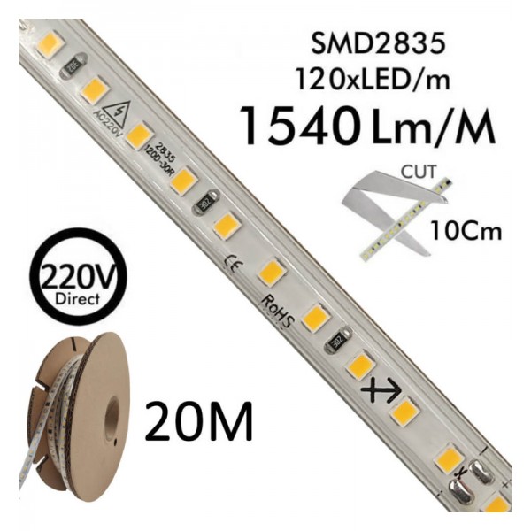 Tira LED 220V | 120xLED/M | 20m | SMD2835 | 1540Lm/M | 14W/M | IP67 | Corte Cada 10cm