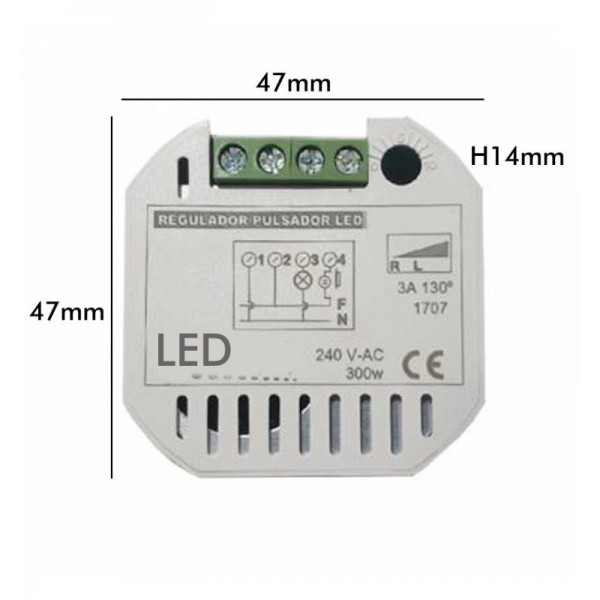 Esta pastilla reguladora para pulsador LED de sistema ON-OFF de corriente AC 220V-240V nos permite controlar la intensidad de la luz emitida del 5 al 95% de todas aquellas luminarias regulables que aceptan soluciones de atenuador LED TRIAC. Soporta una carga máxima de 300W con iluminación LED. Producto pensado para poder colocarlo en caja de mecanismo.