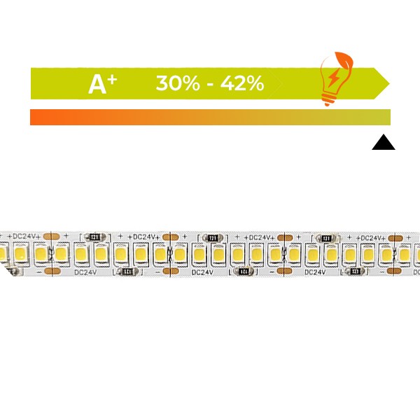 Cette ruban LED 24V DC 238LED / m IP20 a une longueur de 5 mètres et intègre 238 LED de technologie SMD2835 très efficaces qui ne consomment que 30 watts par mètre. La lumière vive et colorée qu'elle émet est étalée à un angle de 120°.