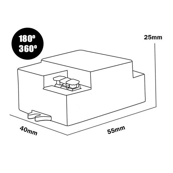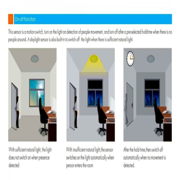 Detector de movimento de micro-ondas, perfeito para instalação em teto falso que permite ajustar o tempo de ignição, sensibilidade à luz e faixa de parada. Tem um ângulo de cobertura de 150º e um campo de detecção de até 5 metros.