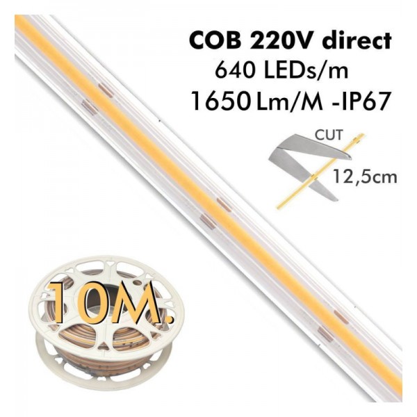 Fita conduzida COB de 15W / METER a 220V e 10 metros com fita adesiva para fácil instalação. Projetado para colocação interna. Perfeito para ILUMINAR todos os tipos de espaços. NÃO requer uma fonte de alimentação e é possível instalá-lo em um perfil de alumínio, uma vez que contém fita adesiva. 680 Leds/metro FLIP CHIP de alta potência.