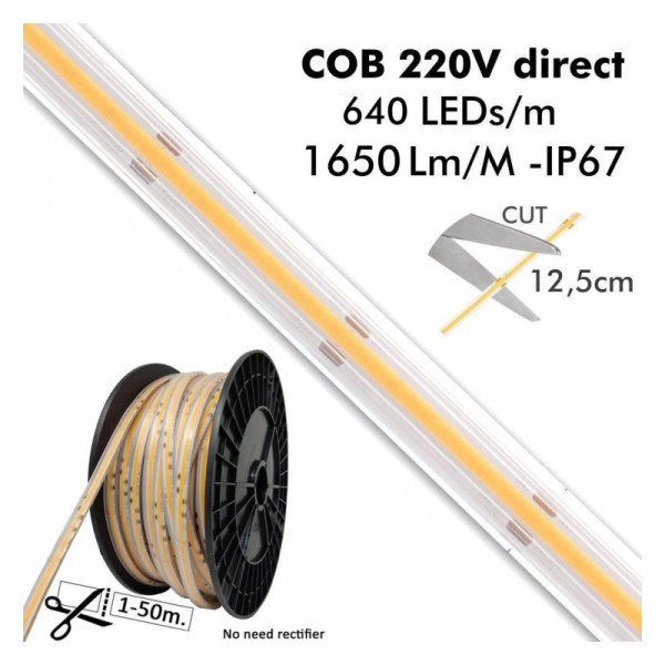 Fita conduzida COB de 12W a 24V e 5 metros com fita adesiva para fácil instalação. Projetado para colocação interna. Perfeito para ILUMINAR todos os tipos de espaços. Requer uma fonte de alimentação e é conveniente instalá-lo em um perfil de alumínio para obter uma boa dissipação de calor. 280 Leds/metro FLIP CHIP de alta potência.