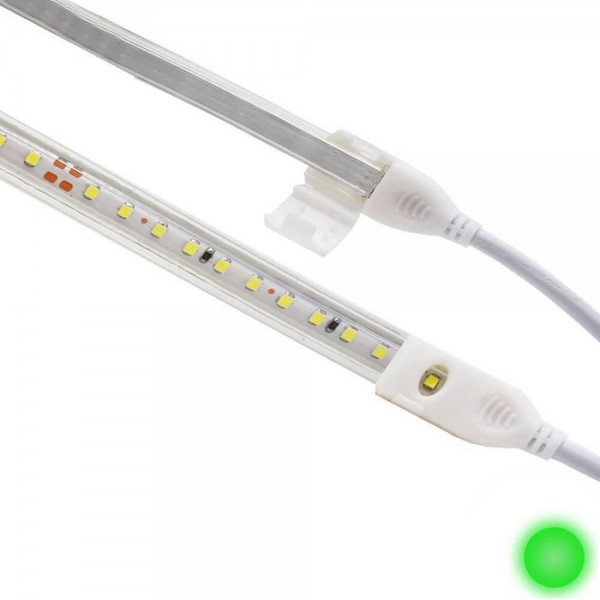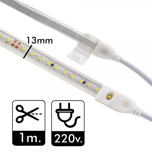 -TIRA LED 220v. AL CORTE- El producto incluye: Cable rectificador + Tira de LED + Tapón final. Medida: 13mm. 120 Diodos SMD2835 por metro se conecta directamente a la red eléctrica mediante un cable rectificador de uso necesario Para uso exterior IP65 es necesario sellar las uniones.