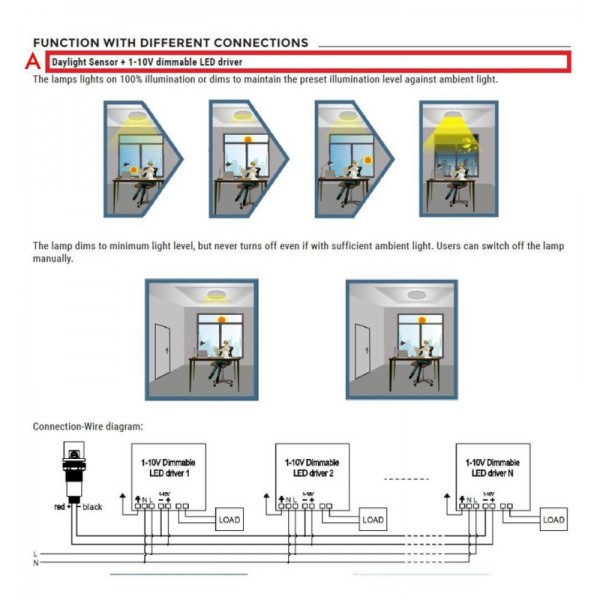 O sensor fotoelétrico é compatível com drivers ajustáveis de 1-10V ou luminárias que suportam regulação de 1-10V. Tem uma área de detecção de 360º e sua faixa de regulação é de 1-100%.