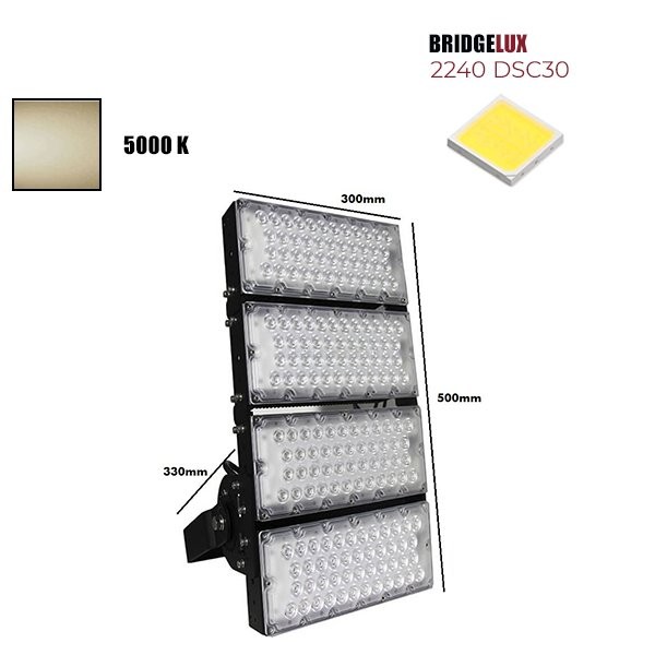 Projetor LED STADIUM alumínio 480W com SMD 5050 12 núcleos com chip BRIDGELUX (EUA); este alcança um desempenho magnífico para o seu design modular. Este Spotlight IP65 inclui o condutor Philips e foi concebido para atingir grandes distâncias graças ao seu ângulo. Perfeito para estádios desportivos, zonas portuárias, arranha-céus de carros.